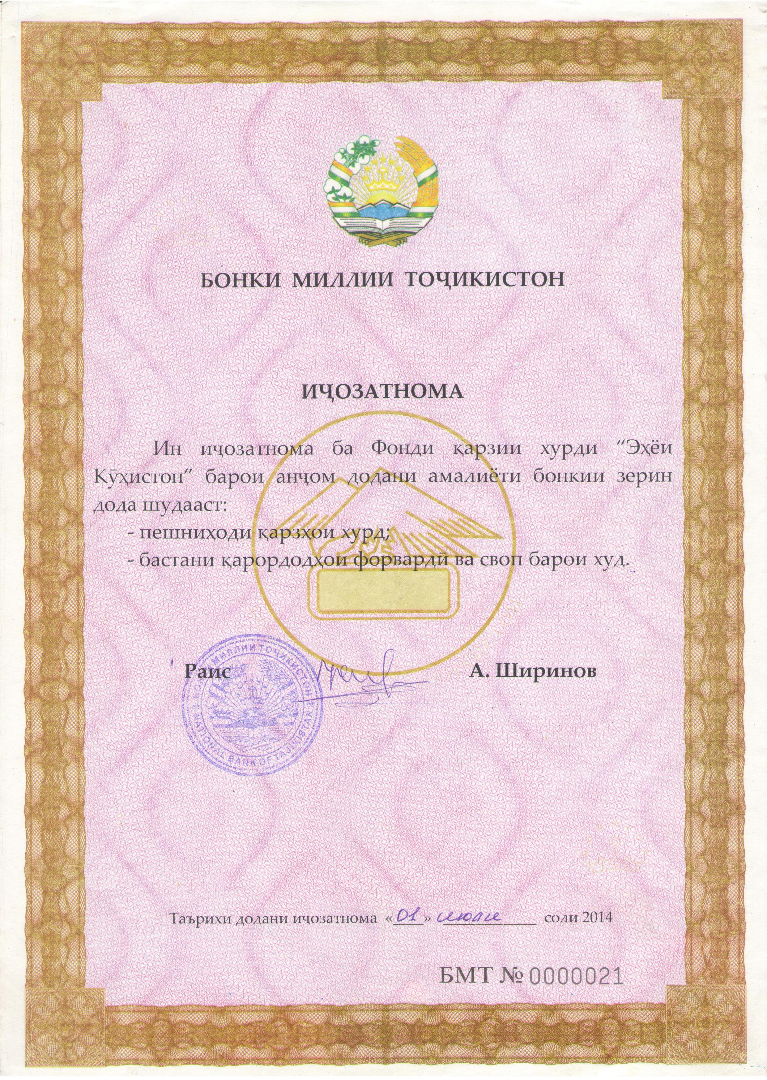Мусоидат намудан дар пастшавии сатҳи камбизоати ва балан бардоштани сатҳи зиндагии мардуми Тоҷикистон, бо роҳ додан ба қарзи хурд ва иҷрои молияви (лизинг) барои баланд бардоштани истеҳсолот, нигоҳдори, коркард ва маркетинги маҳсулоти ғизои, хизматрасони ва дигар фаъолияте, ки қонунгузории Ҷумҳурии Тоҷикистон манъ накардааст.